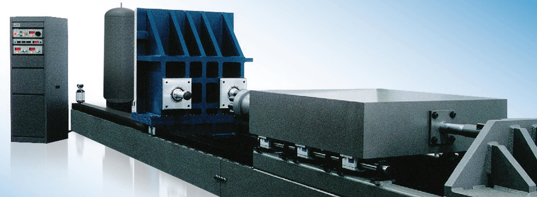 キャリッジ試験台に載せた試験品を、圧縮エアの力で水平に滑走させます。 キャリッジはそのままサイズミックマスに激突し、試験品に横方向の衝撃を加えます。 サイズミックマスには、試験条件に応じたプログラマーが取り付けられており、衝撃波形正弦半波・台形波と加速度作用時間を様々に調整できるようになっています